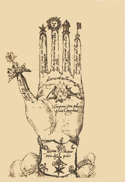 La main apparaît dès lors comme le contenant du mercure secret des philosophes, chaque doigt participant symboliquement à la formation du vase alchimique.