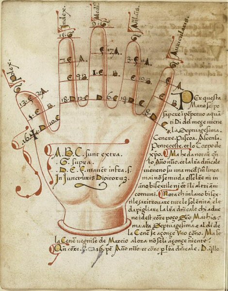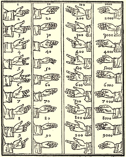 Si aujourd’hui en Europe, la méthode couramment employée repose uniquement sur le dénombrement des doigts (limitant la portée du calcul à dix unités), le système utilisé par les Romains, puis au Moyen Âge, permettait d’atteindre 9 999 en combinant quantité et symbolisme. Dans la Summa de arithmetica, proportioni et proportionalità publiée à Venise en 1494, Luca Pacioli illustre ce système : la main gauche sert à exprimer les unités et les dizaines, la main droite, les centaines et les milliers. Ainsi, dans l’occident médiéval, la main devient le premier « manuel » d’apprentissage : on y apprend à compter, à dénombrer, à calculer grâce aux doigts.