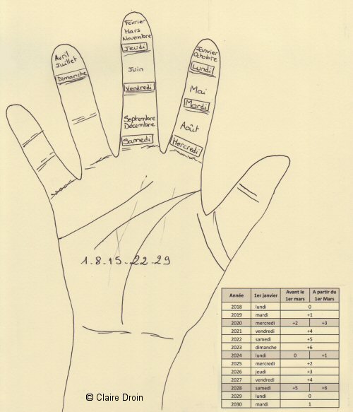 La main apparaît comme un véritable calendrier perpétuel : en attribuant à certaines phalanges les douze mois de l’année et les sept jours de la semaine, il est possible de déterminer la correspondance d’une date sans recours à un calendrier. Ce principe fonctionne de manière directe pour les années communes commençant par un lundi (comme 2018), et moyennant une légère correction pour les années bissextiles ou commençant un autre jour.